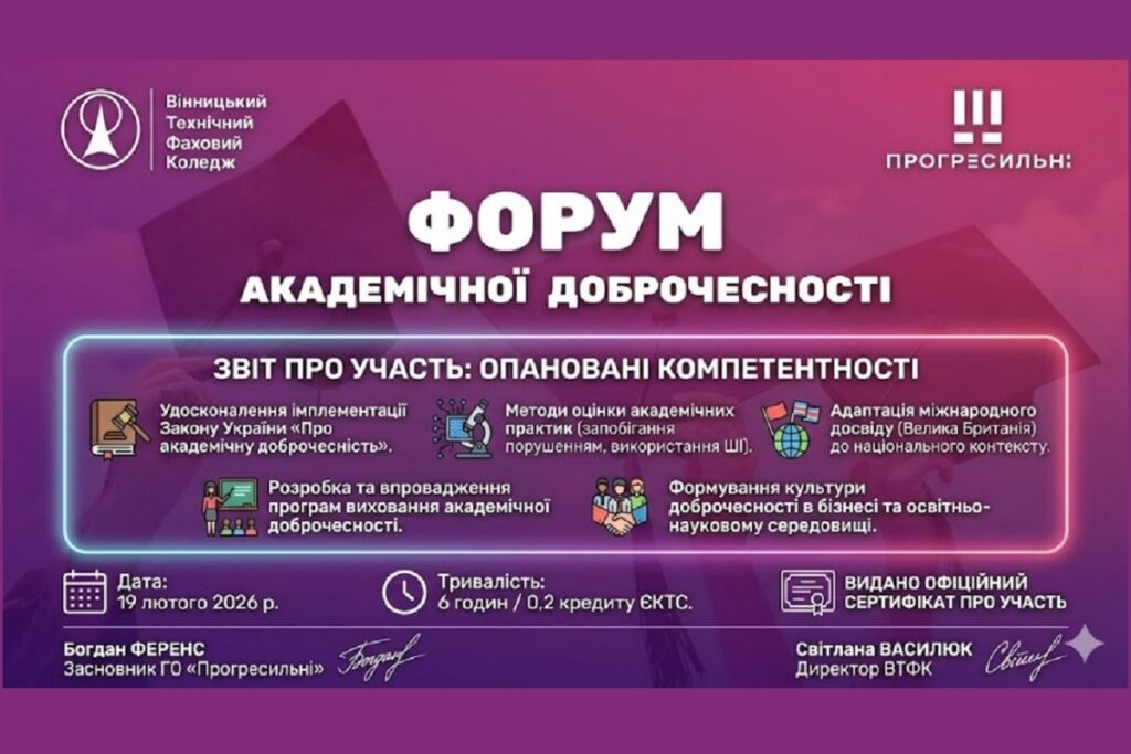 - ФОРУМ АКАДЕМІЧНОЇ ДОБРОЧЕСНОСТІ від ГО «Прогресильні»19 лютого 2026 року викладачі кафедри обліку, аудиту та оподаткування к.е.н., доценти Людмила БОГАТЧИК та… Читати далі »ФОРУМ АКАДЕМІЧНОЇ ДОБРОЧЕСНОСТІ від ГО «Прогресильні»