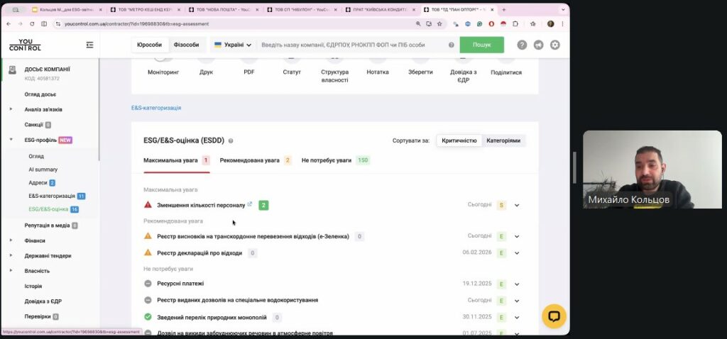 Експерти YouControl продемонстрували, як за допомогою сучасних аналітичних систем можна перевірити ESG-рейтинг контрагентів, оцінити репутаційні ризики та виявити «червоні прапорці» у діяльності компаній ще до початку співпраці.