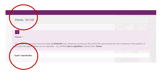 - На початку гри заповни свої данні для сертифікату: повне ім’я та прізвище (англійською), обери університет і т.д.