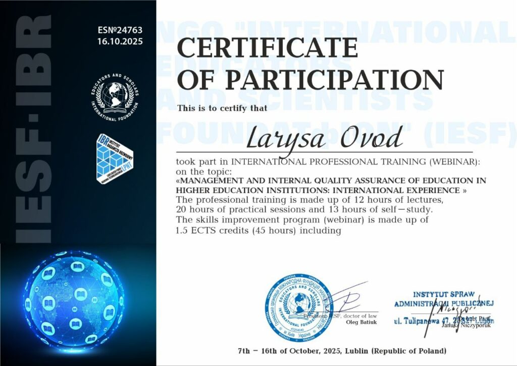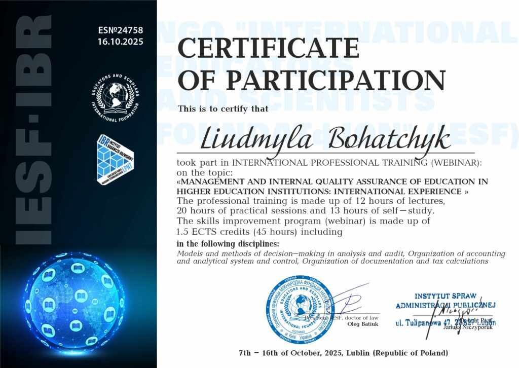 Протягом 07-16 жовтня 2025 року викладачі кафедри обліку, аудиту та оподаткування к.е.н., доц. Людмила БОГАТЧИК та к.е.н., доц. Лариса ОВОД взяли участь у Міжнародному підвищенні кваліфікації «Управління та внутрішнє забезпечення якості освіти у закладах вищої освіти: міжнародний досвід» тривалістю 45 годин (1,5 кредиту ЄКТС), яке було організовано IBR LPNT (m. Lublin, Republic of Poland) та ГО «Міжнародна фундація науковців та освітян» (м. Київ, Україна).