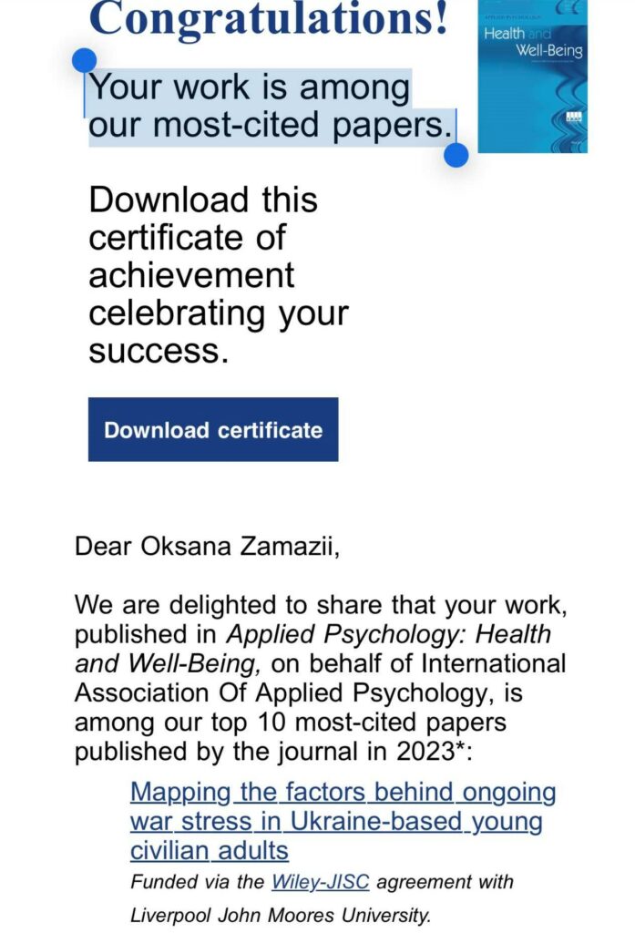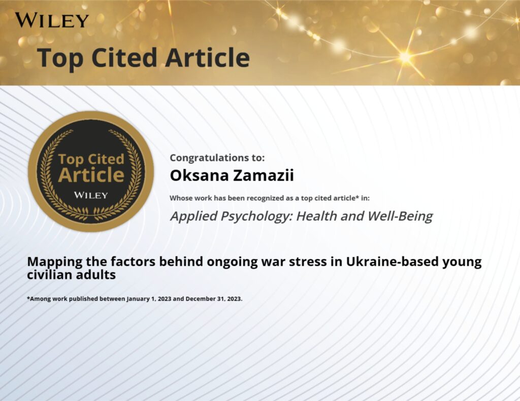 За активної підтримки адміністрації Хмельницького національного університету, зокрема проректора з науково-педагогічної роботи Віктора ЛОПАТОВСЬКОГО та декана факультету економіки та управління Віталія КАРПЕНКА, щодо збору інформації серед учасників освітнього процесу Хмельницького національного університету у межах колаборації із Liverpool John Moores University, дослідження професора кафедри обліку, аудиту та оподаткування Оксани ЗАМАЗІЙ «MAPPING THE FACTORS BEHIND ONGOING WAR STRESS IN UKRAINE-BASED YOUNG CIVILIAN ADULTS» увійшло до ТОП-10 найбільш цитованих статей 2023 року у міжнародному науковому журналі Applied Psychology: Health and Well-Being, що видається від імені Міжнародної асоціації прикладної психології (IAAP).