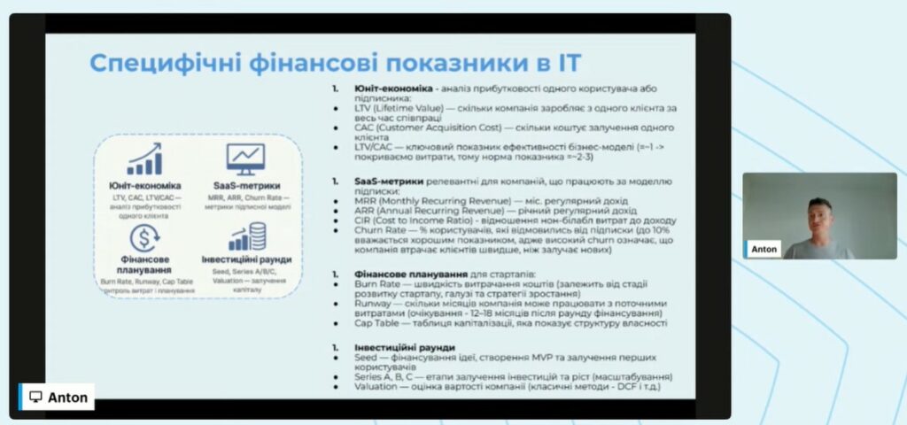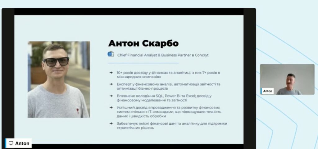 Студенти спеціальності «Облік і оподаткування» під час вивчення навчальної дисципліни «Звітність підприємств» (викладач: канд. екон. наук, доцент Віктор Лопатовський) долучилися до участі у пізнавальному вебінарі, присвяченому сучасним підходам до фінансової звітності та аналітики в бізнесі. Спікером заходу став Антон Скарбо, Chief Financial Analyst & Business Partner у компанії Concryt, який поділився досвідом формування фінансової звітності в ІТ-сфері та розповів, як перетворити звітність на дієвий інструмент стратегічного управління компанією.