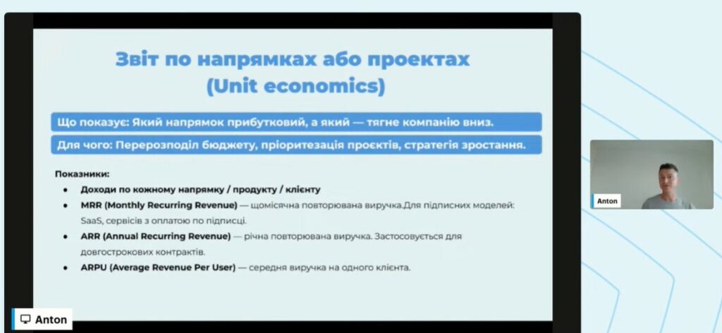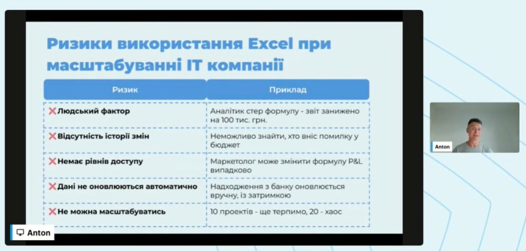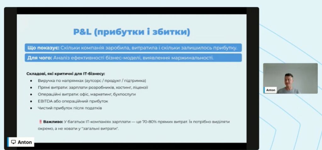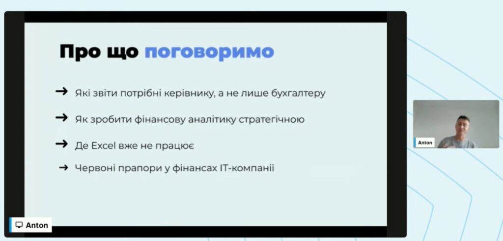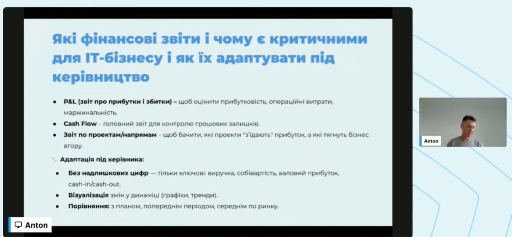 Спікер докладно пояснив, як правильно структурувати та подавати ці звіти без зайвої бюрократії, зробивши їх зрозумілими для керівників і корисними для стратегічного планування. Особливу увагу було приділено питанню, де Excel уже не працює, і які сучасні цифрові інструменти використовують у зростаючих ІТ-компаніях для аналітики, планування та контролю фінансових потоків.