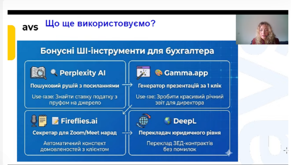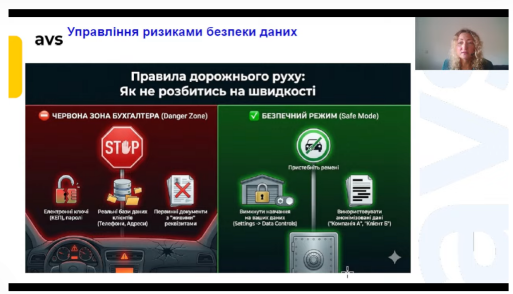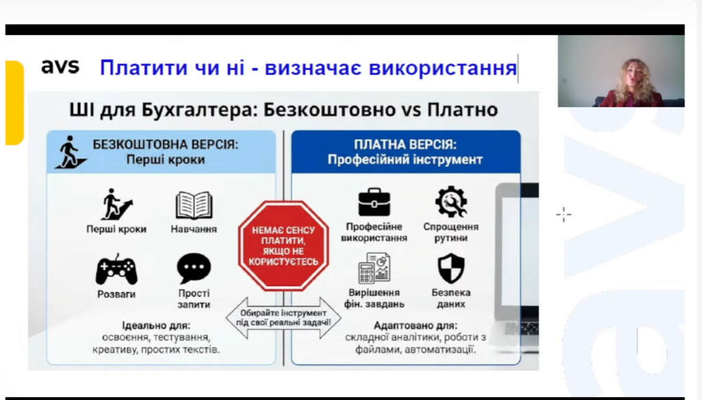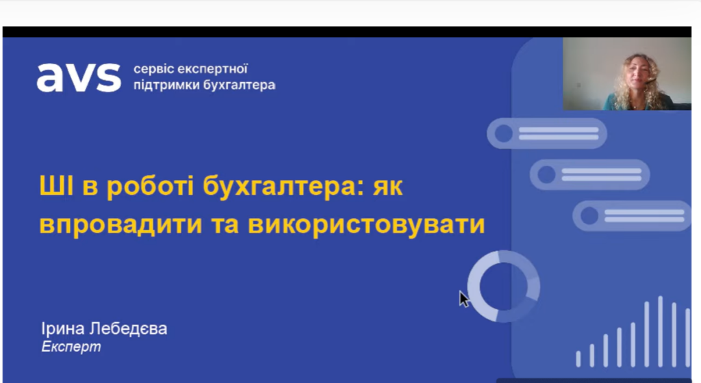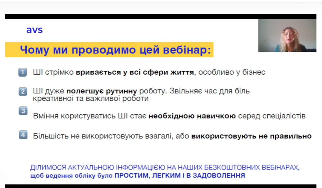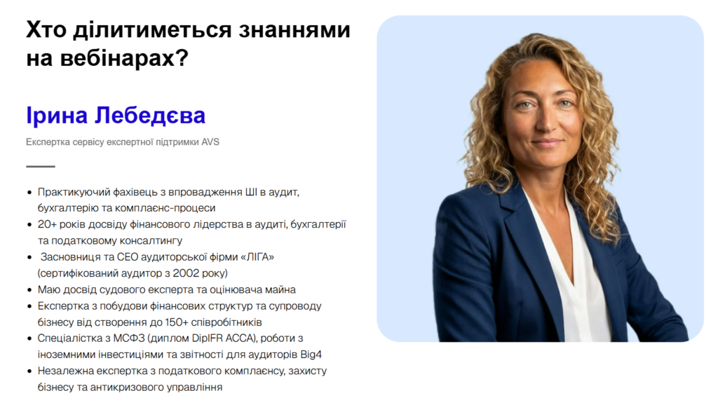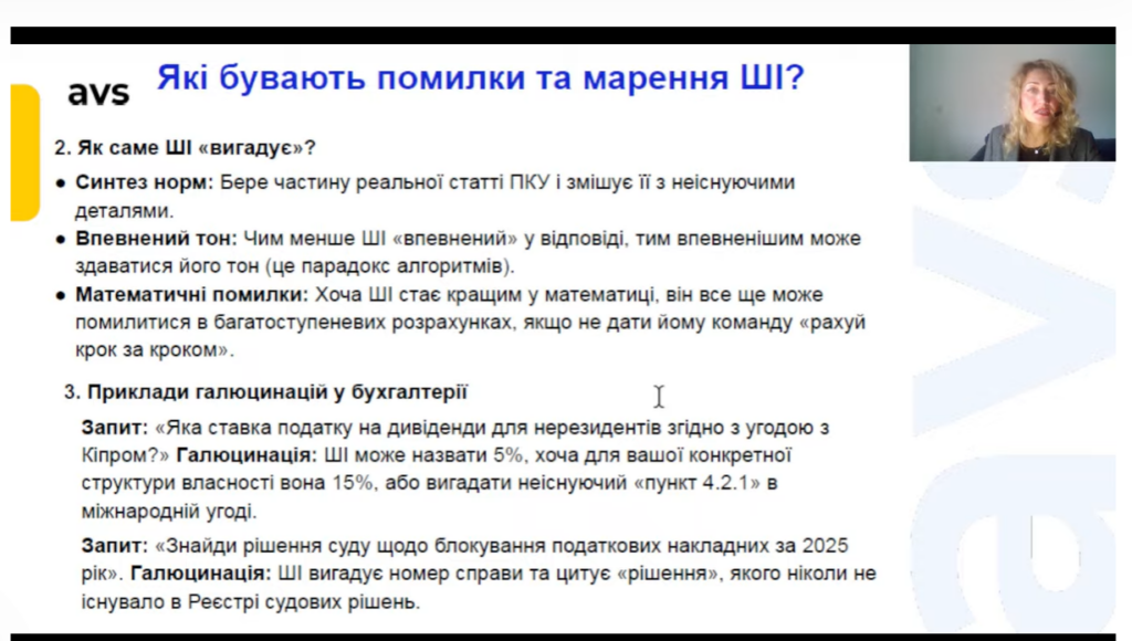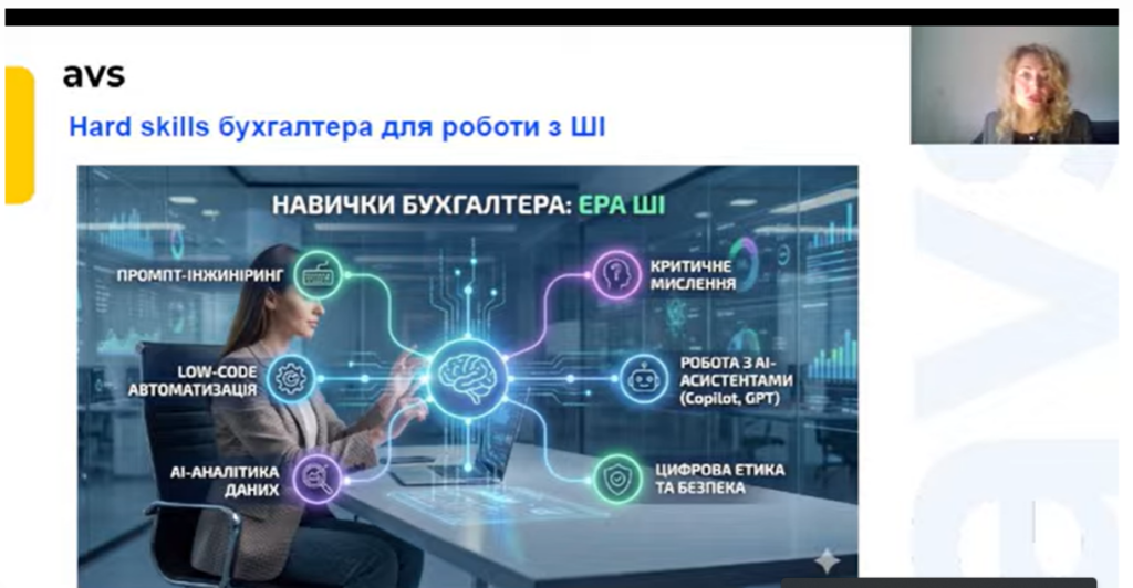 Спікером заходів виступила Ірина Лебедєва – експерт Онлайн-школи бухгалтерії AVS, практикуючий фахівець із впровадження штучного інтелекту в аудит, бухгалтерський облік та комплаєнс-процеси.
