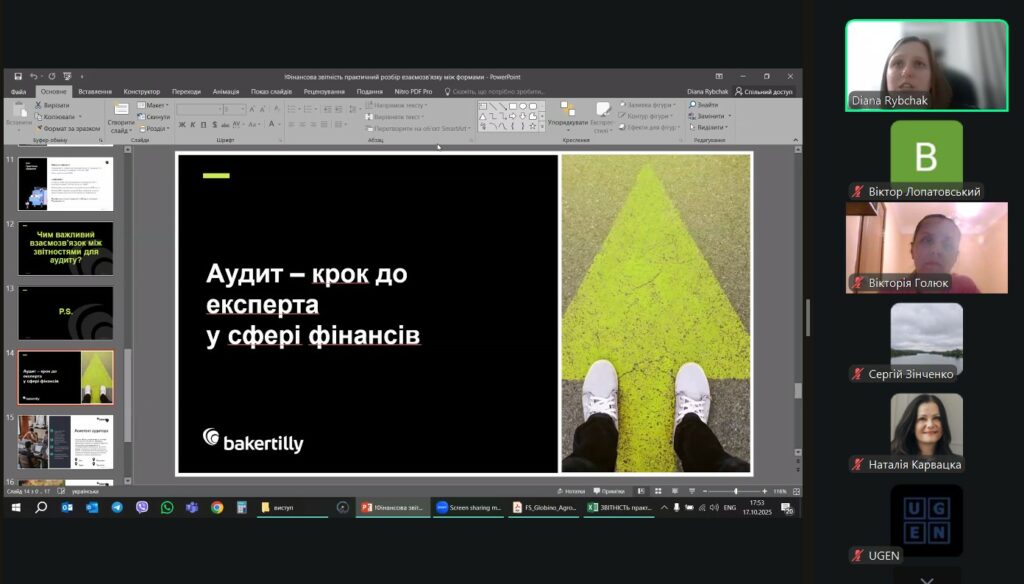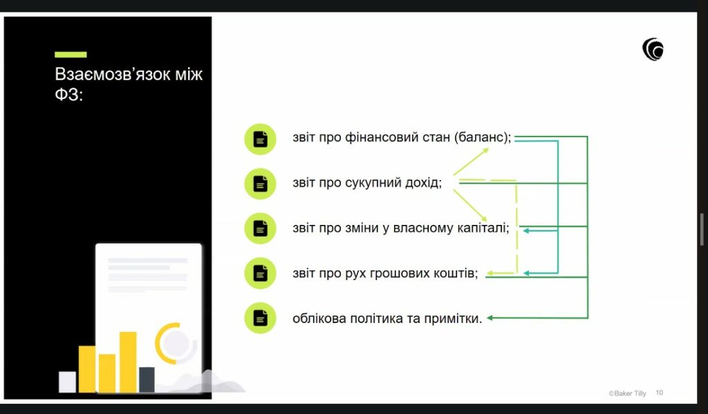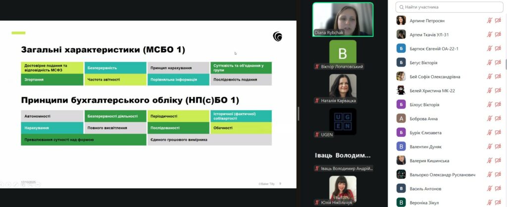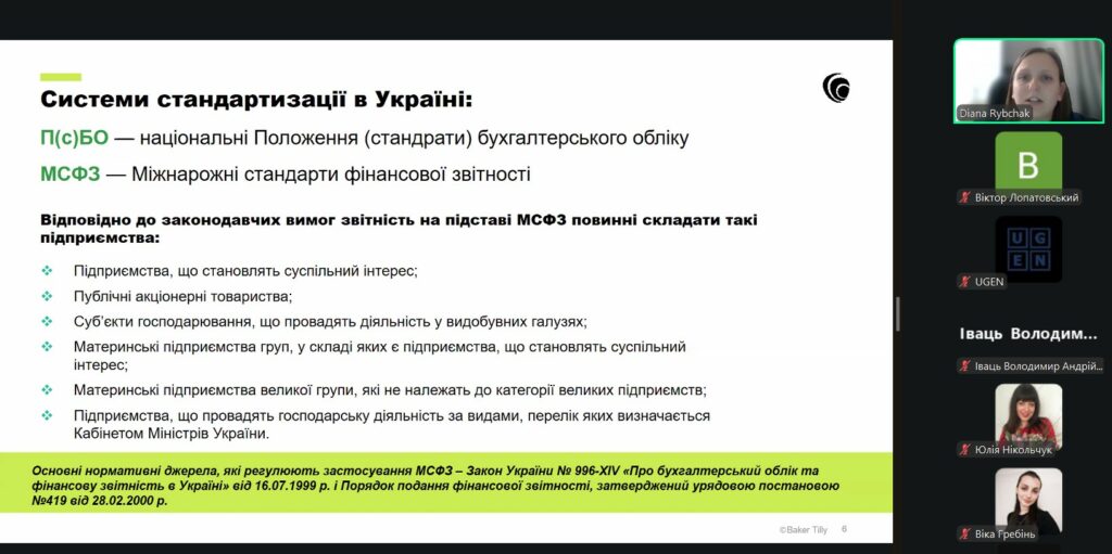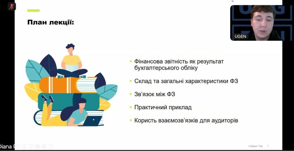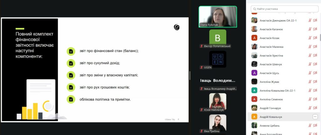 Спікеркою вебінару виступила Діана Рибчак – молодший менеджер Baker Tilly, реєстровий аудитор, САР, DiplFR. Вона під час вебінару закцентувала питання на пошуку практичних взаємозв’язків між даними окремих форм фінансової звітності за допомогою практичної ситуації.
