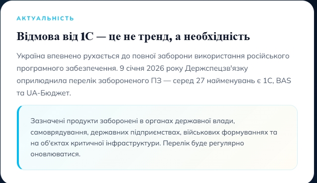 Україна впевнено рухається до повної заборони використання російського програмного забезпечення. 9 січня 2026 року Держспецзв’язку оприлюднила перелік забороненого ПЗ – серед 27 найменувань є 1С, BAS та UA-Бюджет. Тому Відмова від 1С – це не тренд, а необхідність.