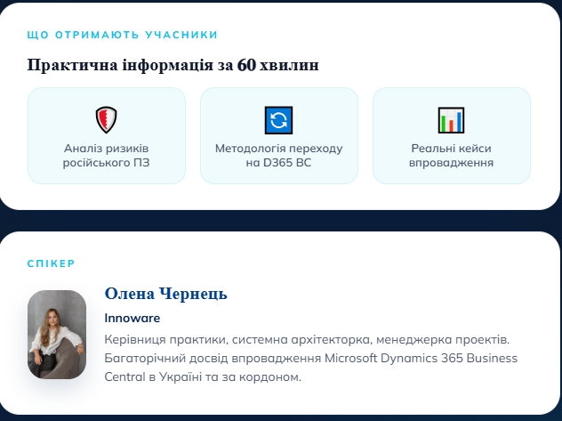 Головною спікеркою вебінару виступила Олена Чернець – керівниця практики, системна архітекторка, менеджерка проектів. Багаторічний досвід впровадження Microsoft Dynamics 365 Business Central в Україні та за кордоном.