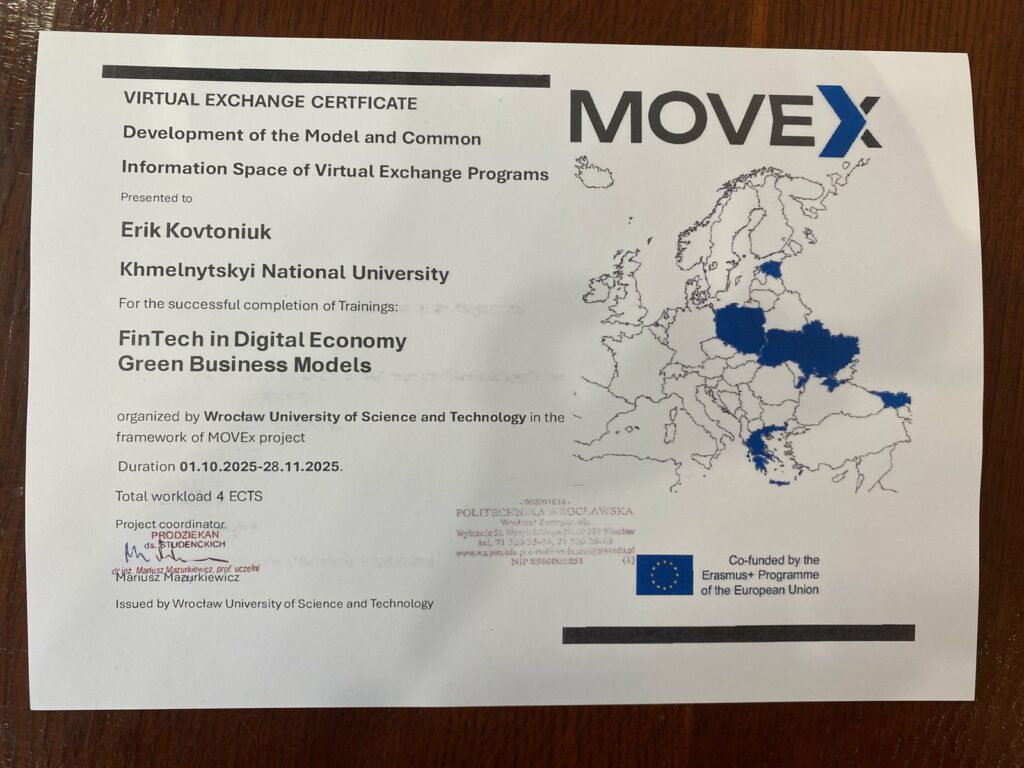 22 грудня 2025 року в Хмельницькому національному університеті відбулося урочисте вручення сертифікатів 20 студентам, які успішно завершили програму віртуальних академічних обмінів у рамках міжнародного проєкту Erasmus+ MOVEx. Ця подія стала яскравим підтвердженням інтеграції ХНУ у світовий освітній простір та готовності наших студентів до викликів сучасного глобалізованого світу.