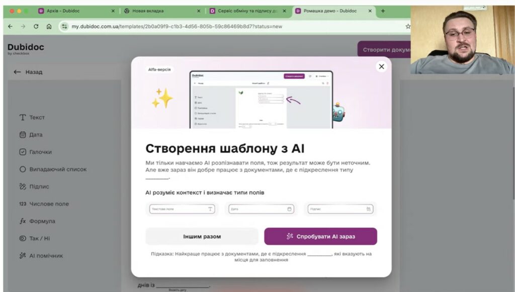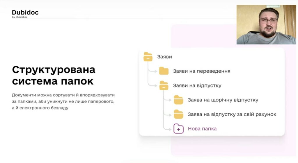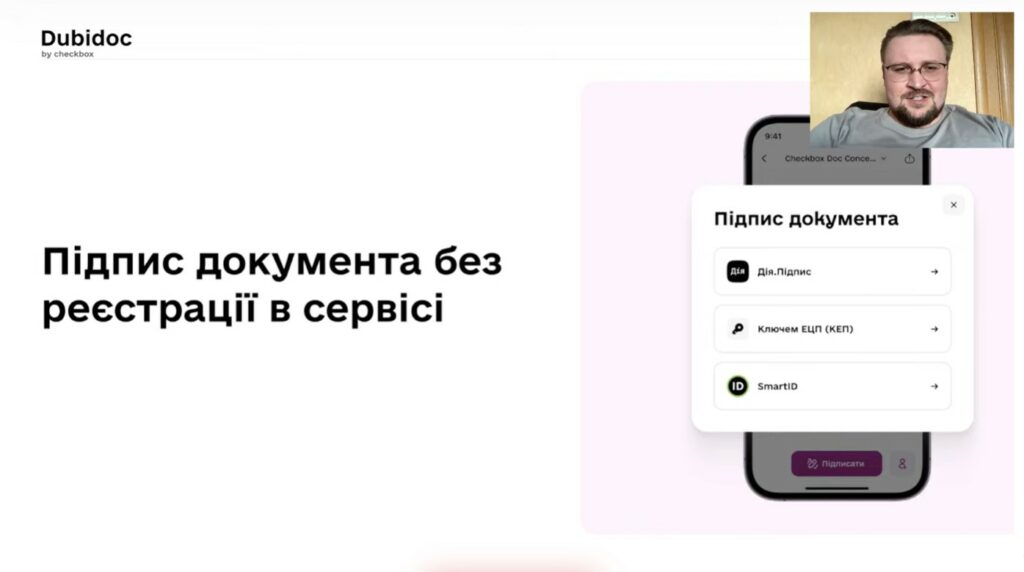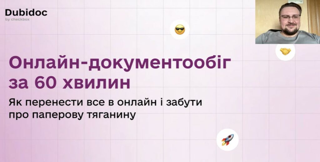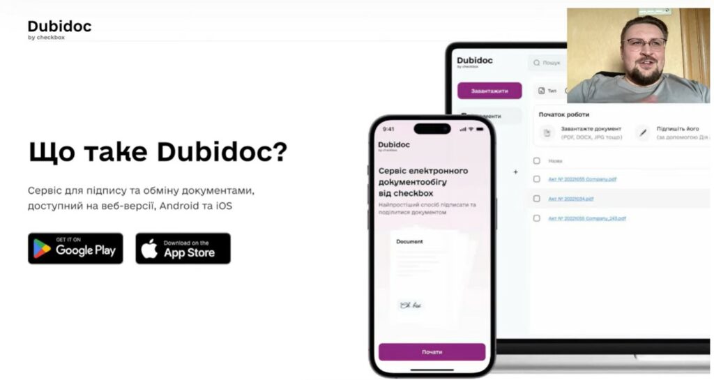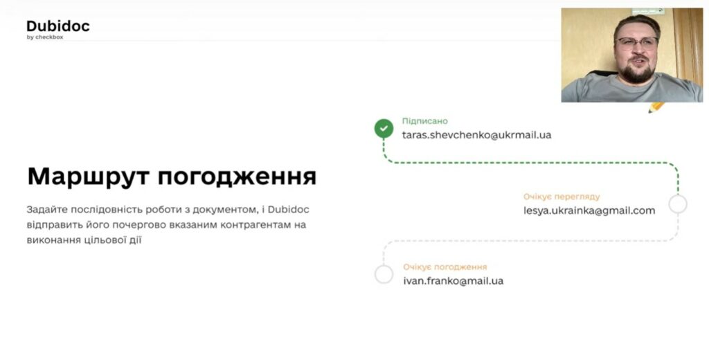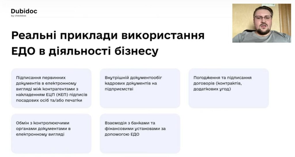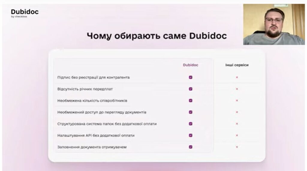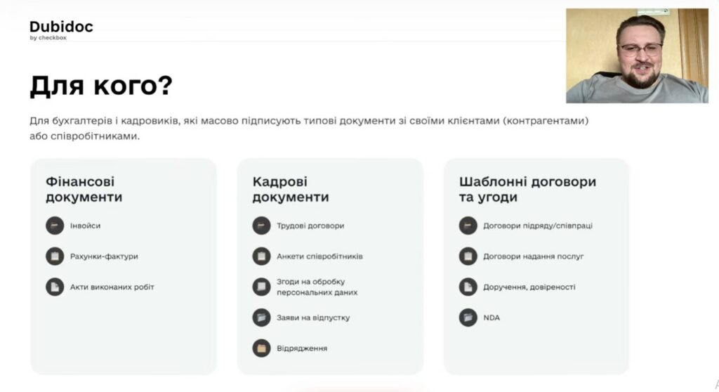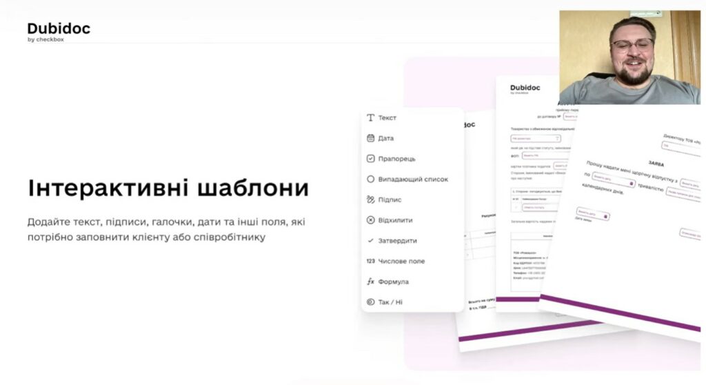 Слухачам було продемонстровано можливості сервісу електронного документообігу Dubidoc щодо вирішення комплексу завдань, які пов’язані з переведенням в електронний формат окремих кадрових, фінансових документів, а також договорів і угод. Серед беззаперечних переваг роботи в сервісі фахівці Dubidoc відмітили можливість підпису документа без реєстрації в програмному продукті, легкість відслідковування та коригування маршруту переміщення електронного документу між працівниками підприємства, можливість структурування інформації з урахуванням потреб користувача, зручна у використанні база контрагентів та ін. Цікавою була презентація роботи з інтерактивними шаблонами в Dubidoc, а також продемонстровані можливості використання АРІ Dubidoc.