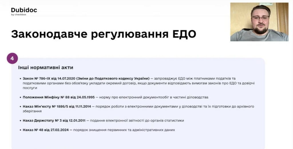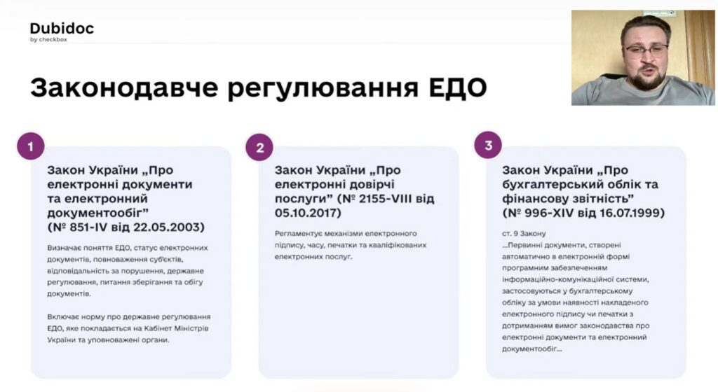 Під час доповіді спікер детально зупинився на особливостях законодавчого регулювання електронного документообігу (далі – ЕДО) в Україні та детально проаналізував ділянки обліку вітчизняних суб’єктів господарювання, в яких сьогодні знайшло практичну реалізацію використання систем ЕДО.
