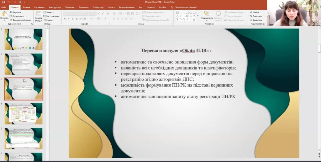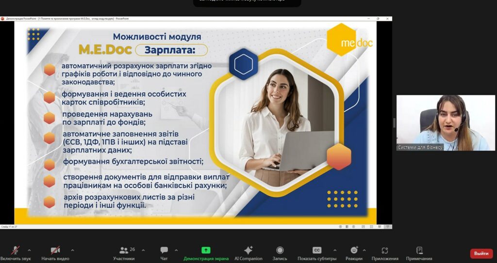 Протягом жовтня 2025 року бажаючі здобувачі першого (бакалаврського) рівня вищої освіти ОП «Облік і оподаткування» отримали унікальну можливість – прослухати теоретико-практичний курс по роботі з програмним продуктом M.E.Doc від партнера кафедри обліку, аудиту та оподаткування ХНУ – ТОВ «Системи для бізнесу». Відмітимо, що курс було розроблено представниками стейкхолдера кафедри спеціально для здобувачів ОП «Облік і оподаткування», з урахуванням вимог до підготовки фахівців за цим напрямом у Хмельницькому національному університеті. Захід було реалізовано завдяки серії організаційних зустрічей представників ТОВ «Системи для бізнесу» з викладачами кафедри обліку, аудиту та оподаткування ХНУ, які дозволили визначити рівень підготовки та змістовне наповнення запропонованих для опрацювання матеріалів, а також узгодити формат зустрічей та контрольні точки для перевірки знань слухачів курсів.